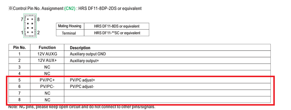 CN2 PIN5/PIN6功能原為快速輸出響應,考慮頻率500Hz~1KHz在部分應用上不夠快速,因此優(yōu)化版本取消此功能(圖三),新版本CN2 PIN5/PIN6改為PV/PC功能,PIN7/PIN8設為空PIN。